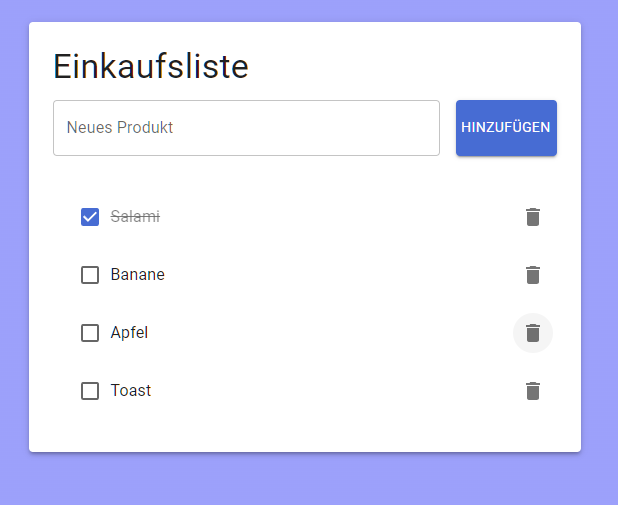Dieses Projekt ist eine vollständige Full‑Stack‑Webanwendung, mit der Nutzer Produkte zu einer Einkaufsliste hinzufügen, abhaken und löschen können. Das Backend basiert auf Express + TypeScript und stellt eine REST‑API bereit, während das Frontend mit React + TypeScript eine moderne, responsive Benutzeroberfläche bietet. Die Daten werden in MongoDB gespeichert und über Mongoose verwaltet. Der Fokus lag auf sauberer Architektur, Typsicherheit, klarer Komponentenstruktur und einer einfachen, aber ansprechenden UI.